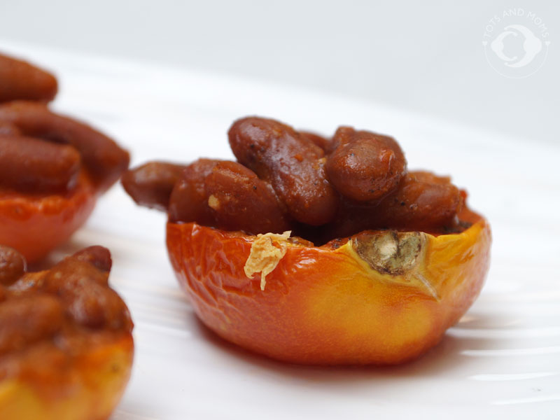 5. By now our Tomato Cups would be grilled well and ready. Take them to a plate, fill Rajma Masala into it and serve. Drizzle a bit more herbs on it if you feel essential.Tomato Rajma Bites Recipe for Kids hindi kannada